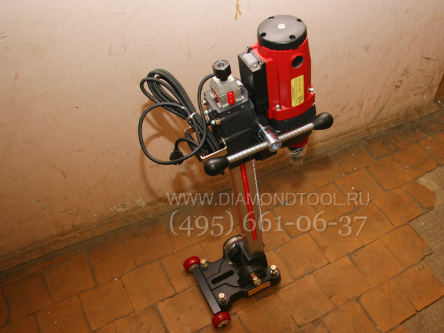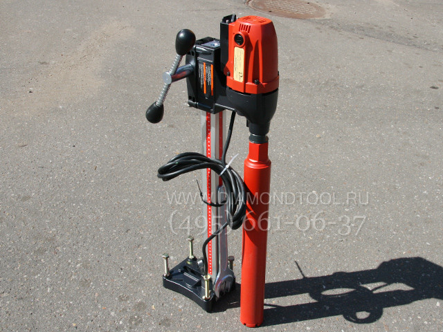 Прочная стальная сверлильная стойка является особенностью данных моделей алмазных установок, быстросъемное соединение сверлильной стойки и мотора, наличие редуктора для плавной подачи алмазной коронки. Отличительными особенностями является то, что сверлильная алмазная установка легко и быстро собирается и разбирается, регулировка наклона и настройка станины производится без использования специального инструмента. Данная модель электродвигателя со встроенной электронной системой защиты, для алмазного сверления отверстий до диаметра 160 мм. Соединительный хвостовик двигателя алмазной установки - универсальный, имеет внешнюю резьбы 1 1/4" и внутреннюю резьбу 1/2", т.е. подходит для алмазных коронок любых производителей.