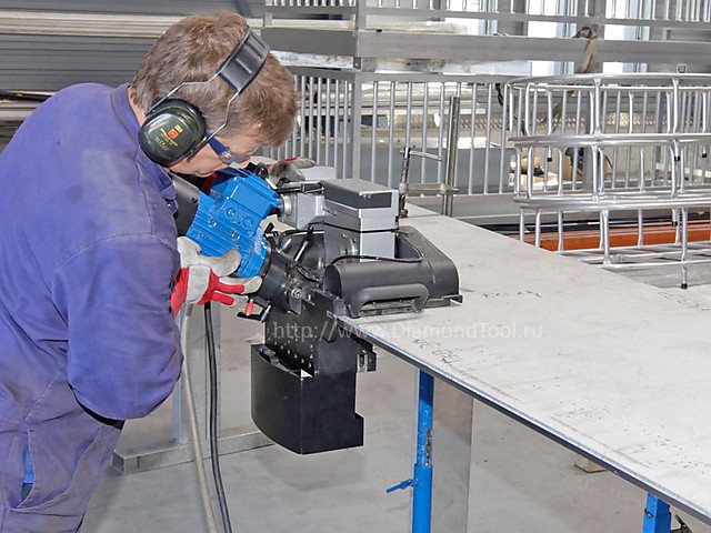 Автоматический станок для снятия фаски на прямых металлических листах. Автоматическая подача существенно облегчает работу с длинными поверхностями и помогает исключить ошибки. Средняя скорость снятия фаски данным агрегатом составляет порядка 500 мм в минуту. Режущий инструмент станка состоит из 4 твердосплавных лезвий, заточенных с разных сторон. Это позволяет быстро переставить лезвие другой стороной в случае затупления, сокращая время простоя оборудования.