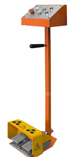 - Стойка управления с двумя ножными педалями и кнопкой аварийной остановки снабжена удобной ручкой для переноски.