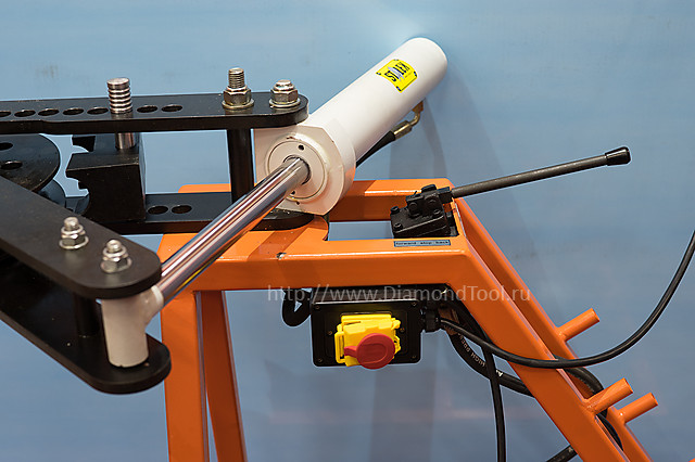 Гидравлический трубогиб с электроприводом HTB-1000 предназначен для изгибания круглых труб из металла или другого материала по заданному радиусу. Удобное управление гидроцилиндром и компактная гидравлическая насосная станция позволяют быстро производить гибку на нужный угол. Продуманная простая система рычагов, приводимая в движение гидравлическим цилиндром, развивает большое усилие гибки. Гибка трубы происходит вокруг штампа-шаблона, что обеспечивает точность изгиба трубы на заданный угол и с заданным радиусом. Максимальный угол гиба 0 - 120°, возможен гиб 0 - 240° на дополнительных штампах. Стандартный набор штампов позволяет изготавливать множество вариантов гибки труб различной конфигурации и в разных плоскостях.