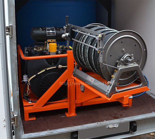 Гидродинамическая установка, работающая при помощи бензинового привода Kohler с электростартером мощностью 36 л/с. Конструкция состоит из бака для воды емкостью 1000 литров, катушки с шлангом высокого давления длиной до 80 метров и насоса высокого давления UDOR, приводимого в действие при помощи бензинового двигателя. Эти элементы смонтированы на прочной раме, которая помещается на любой автомобильный кузов или прицеп. Установка предназначена для прочистки каналов и труб диаметром до 1200 мм. Под заказ на данный агрегат можно установить бак для воды большего объема и насос 200 бар с потоком 55 л/мин.