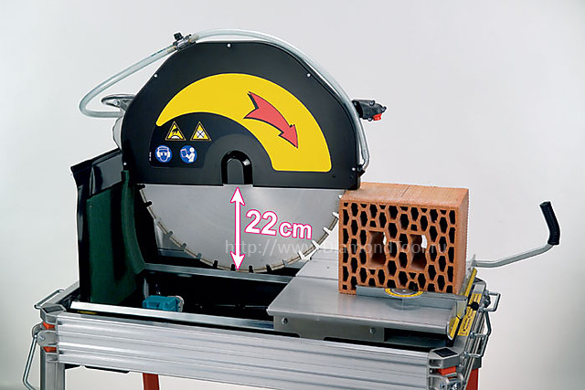 Камнерезный станок для работы на строительных объектах, существенно упрощает обработку камня, кирпича, мрамора и поротона. Электрический трехфазный мотор мощностью 4 кВт позволяет использовать диски диаметром до 500 мм и разрезать блоки высотой до 170 мм в один проход и блоки высотой до 235 мм в два прохода.