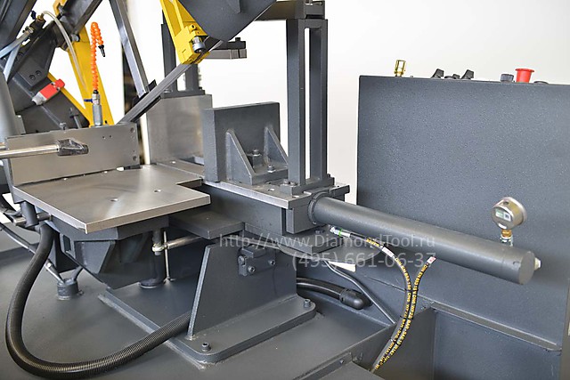 - Гидромеханическая система натяжения ленточнопильного полотна с манометром, обеспечивает надежную фиксацию рекомендуемого значения натяжения.