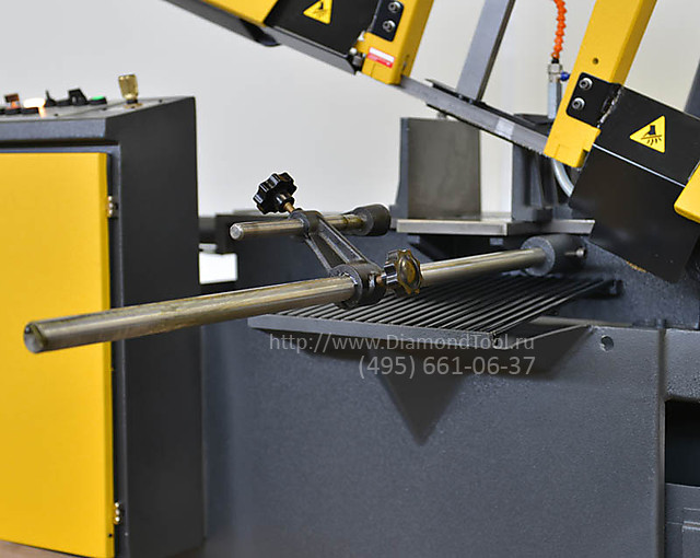 - Мощные вертикальные направляющие с блоком подшипников и твердосплавных пластин позволяют избежать отклонения полотна при резке сплошных материалов. Ручная регулировка положения в зависимости от ширины заготовки.