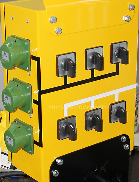 Разветвитель VPK Formwork 2/6 предназначен для подключения до 6-ти внешних вибраторов. Представляет собой коммутационное устройство с возможностью работы как от 1-ого преобразователя частоты, так и одновременно от 2-х независимых преобразователей. Для этого на входе имеются два кабеля с вилками 42В и 200 Гц. Минимальный ток каждой линии должен составлять 20 А. Каждый из двух кабелей питает группу розеток (3 шт.) через группу переключателей (3 шт.) для подключения шести внешних вибраторов.
