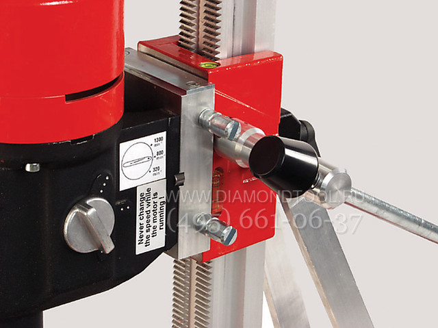 Ridgid RB-208 - это профессиональная установка алмазного бурения для сверления отверстий алмазными коронками в конструкциях из железобетона, монолита и кирпича диаметром до 200 мм на глубину до 4-х метров. Эта установка позволяет осуществлять бурение отверстий под углом до 45 градусов. При помощи уровня и ходовых винтв, расположенных в основании станины, можно строго соблюсти перпендикулярность отверстия к поверхности железобетонного перекрытия.